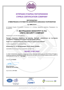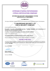 Στα πλαίσια της παροχής υψηλού επιπέδου υπηρεσιών η Γ. Μαυρεδάκης Security ΕΠΕ είναι πιστοποιημένη σύμφωνα με τα πρότυπα ELOT EN ISO 9001:2015 , ISO 14001:2015 , ΙSO 45001:2018 και ISO 27001:2022 για τη Παροχή Υπηρεσιών Ασφαλείας και Φύλαξης. Εμπορία , εγκατάσταση και συντήρηση συστημάτων ασφαλείας εσωτερικών και εξωτερικών χώρων.